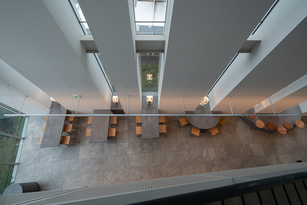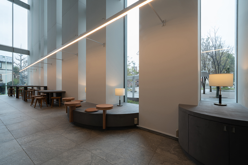 客席の上には細長い空間の奥行を強調するように、15mにも及ぶライン状のシンプルな照明器具をデザインした。机上の明るさを確保すると共に、訪れるひとを奥へと導くガイドラインとしても機能する。また調光調色システムを導入し、時間や採光に応じた照度と色温度によってカフェを利用する人たちの体内時計に寄与する。