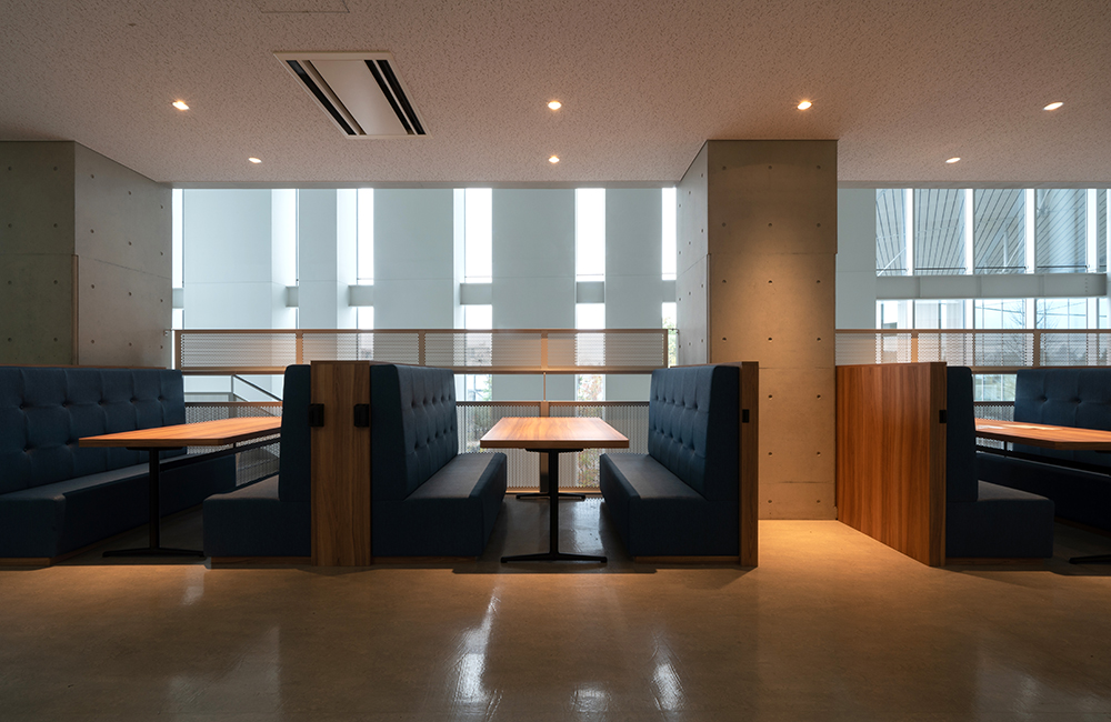 2階のソファ席は学生食堂としての機能も併せ持ち、多人数でも受け入れ可能な席数を確保。二期工事では、さらに正門広場に面してテラス席を増床、そこから新たなエントランスを設け、地域に開かれたカフェとしてデザインを展開する予定である。