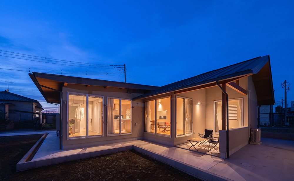 施主からは、広々とした豊かな敷地を享受できる平屋であること、また軒がある切妻屋根の掛かる日本的な佇まいであることが求められた。