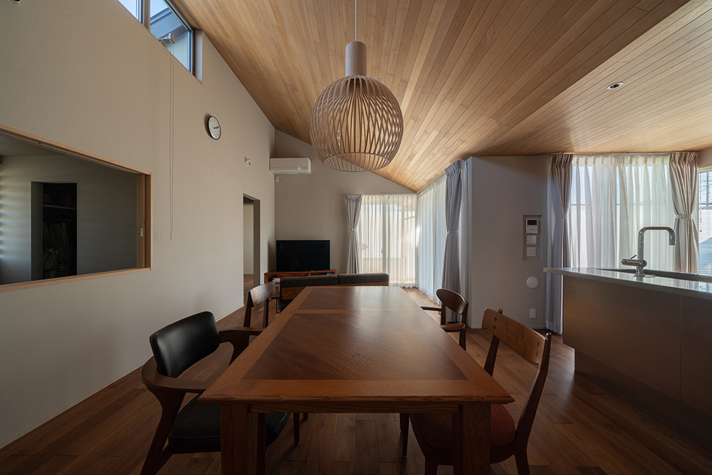 L型プランの交点となる採光が届かないダイニングルームには、ハイサイドライトを設け、北側からおだやかな光を取りこんでいる。