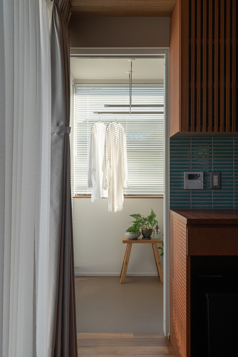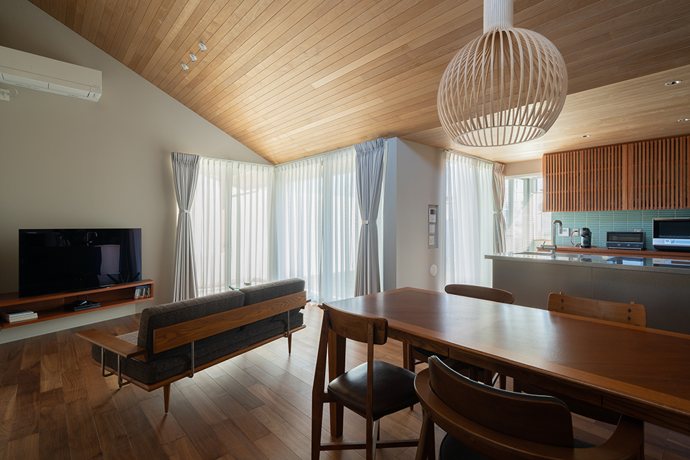 南側にLDK+サンルーム、北側に各寝室を設けている。ダイニングルームと主寝室を間仕切るガラス戸は、緩やかに空間を結ぶことで様々な暮らしのシーンを想像した。