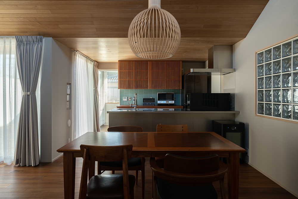 玄関を入ると正面のガラスブロックからLDKの気配を伺いながら、天井高さを低く抑えた廊下を抜けると、板張り勾配天井のLDKへと連なる。