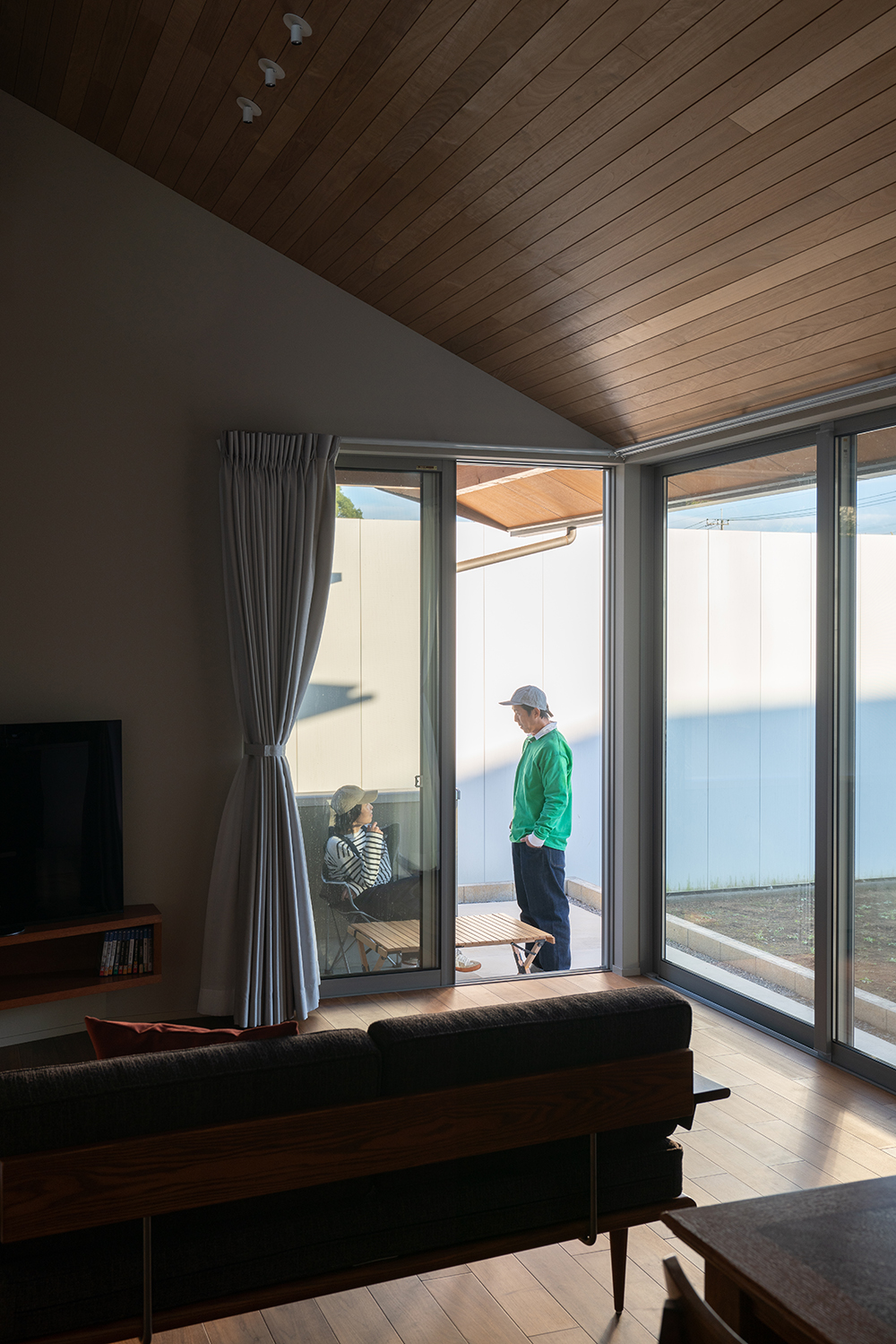 リビングルームの先に隣接して大屋根の掛かる軒下空間を設けた。リビングのアウタールームとして、また将来の変化に対応するこの家の「余白」として機能することを期待している。