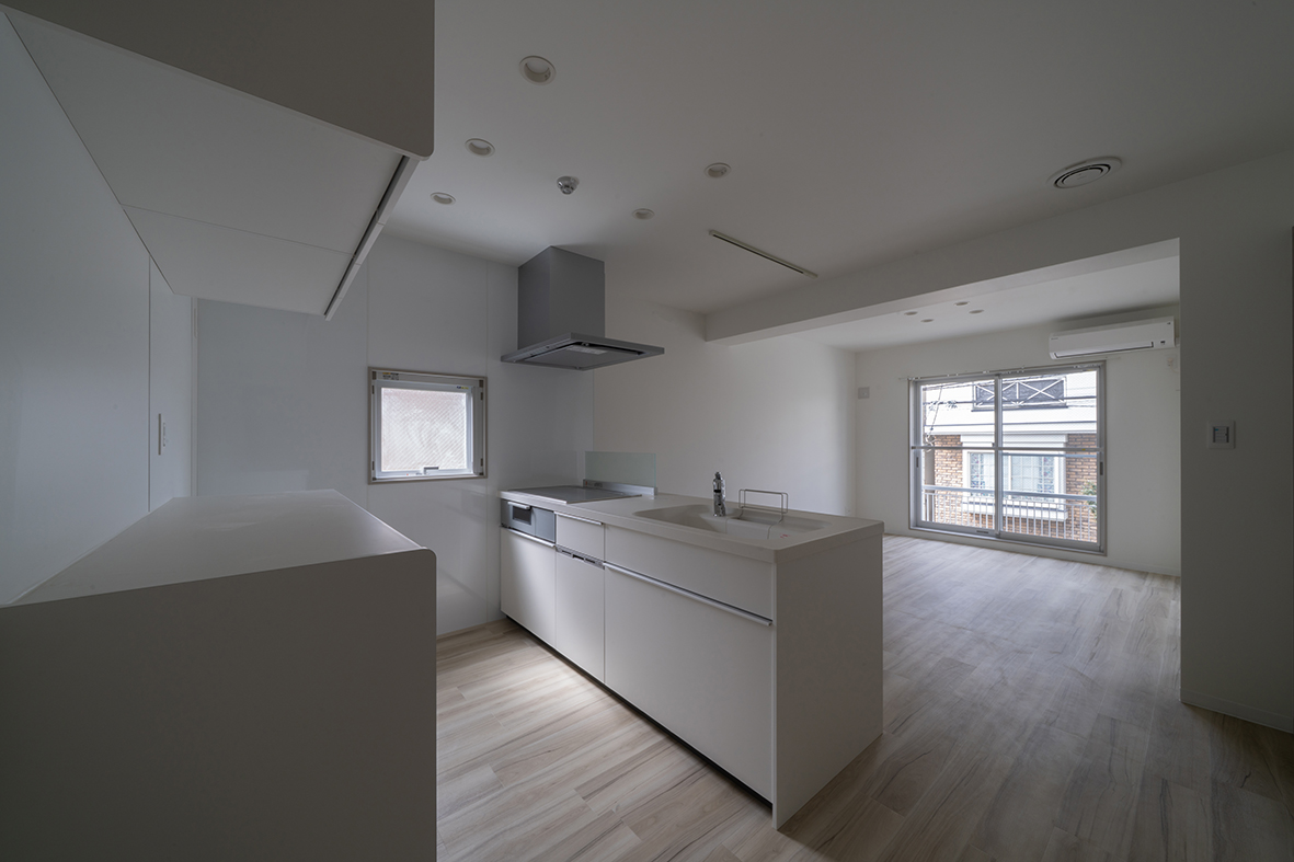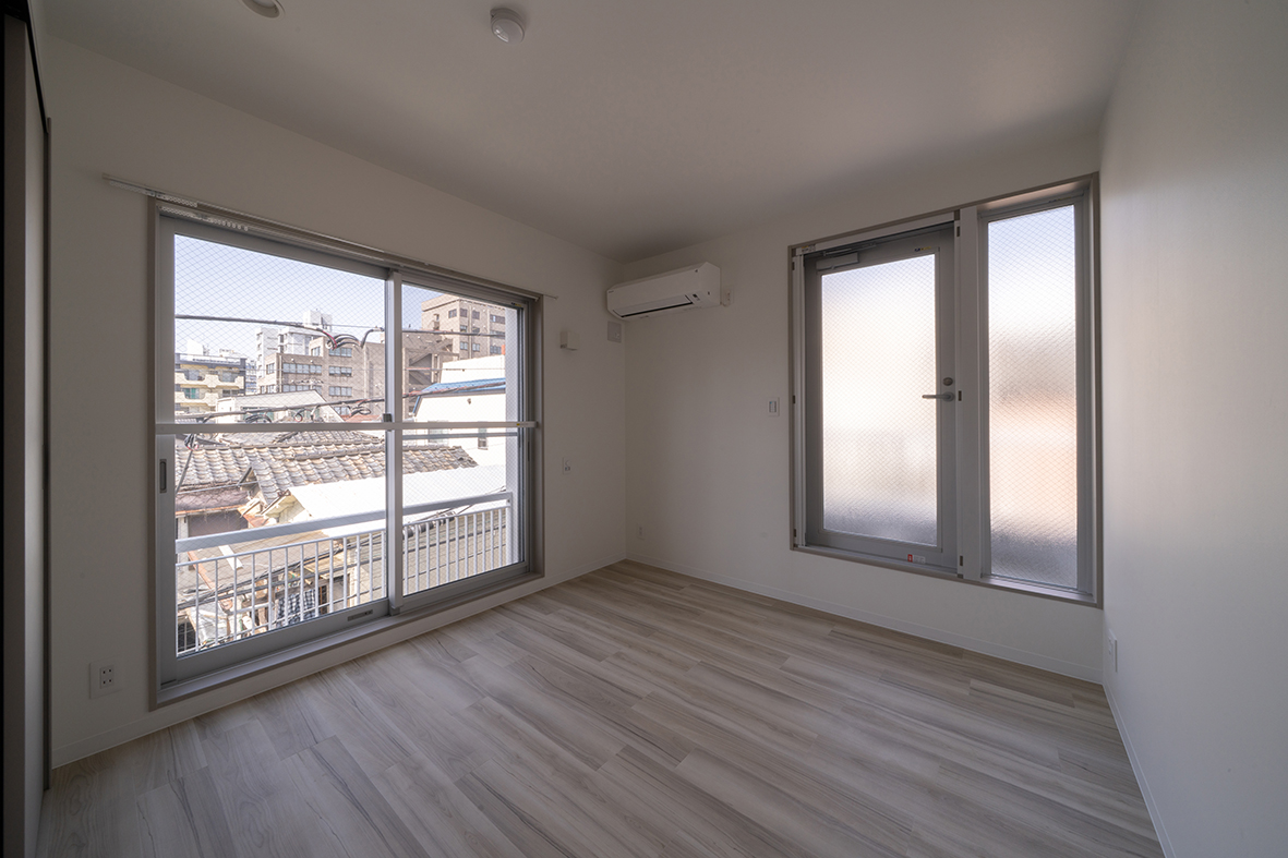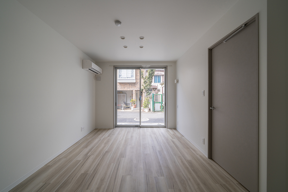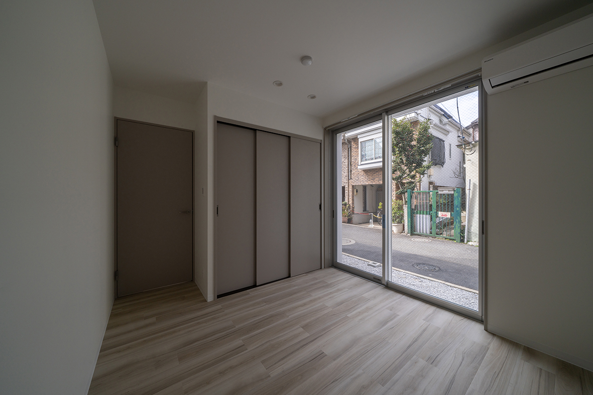 建物周囲の状況をそのまま積極的に内部に取り込むため、各室とも大きな引き違い窓を採用している。ベッドを置くと埋まってしまうコンパクトな寝室で、ホテルでは味わえない混沌とした「東京でのリアルな暮らし」を存分に感じてもらうことを意図している。