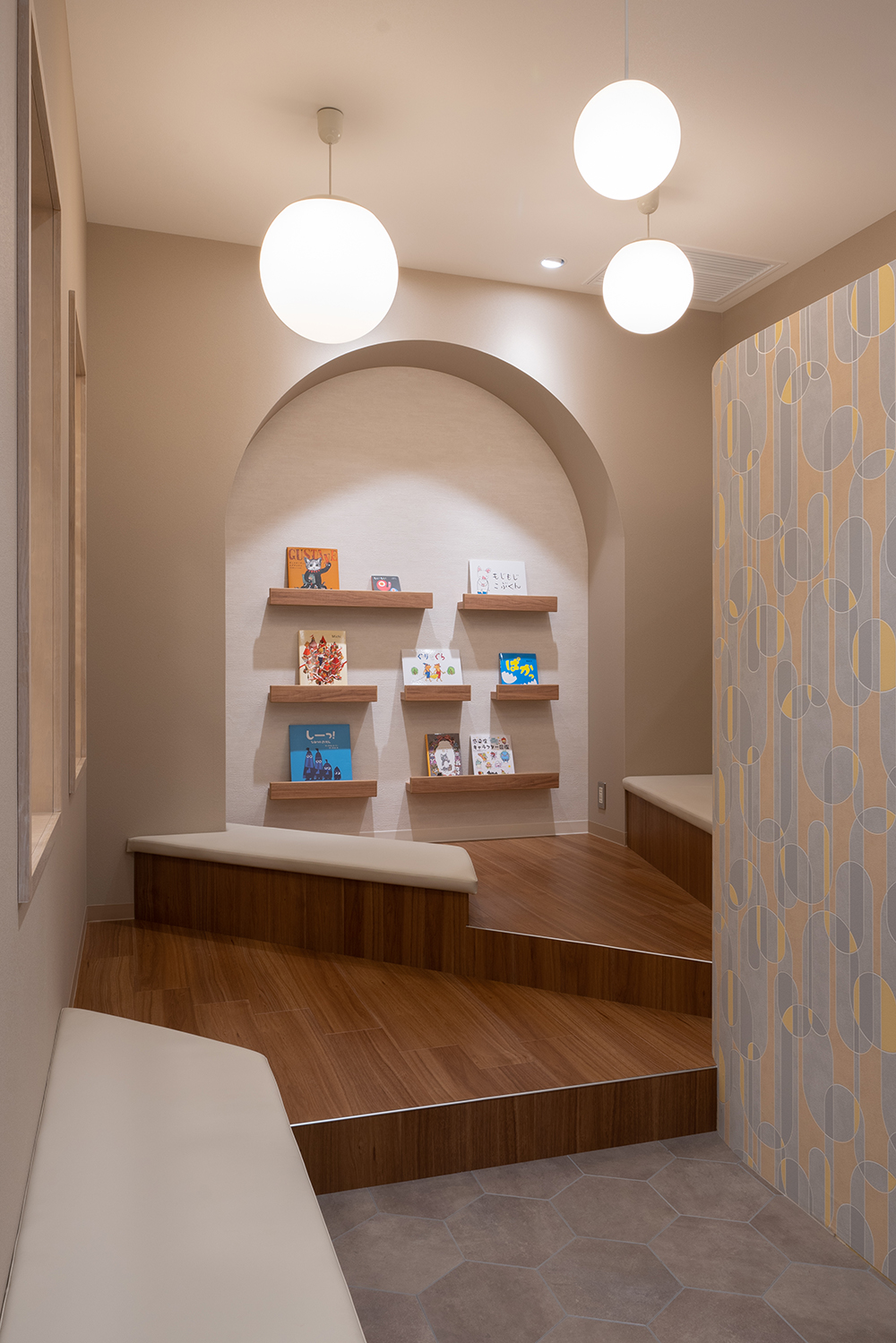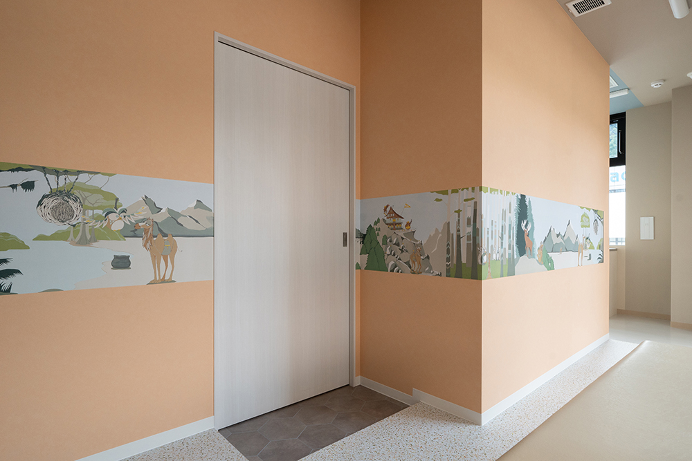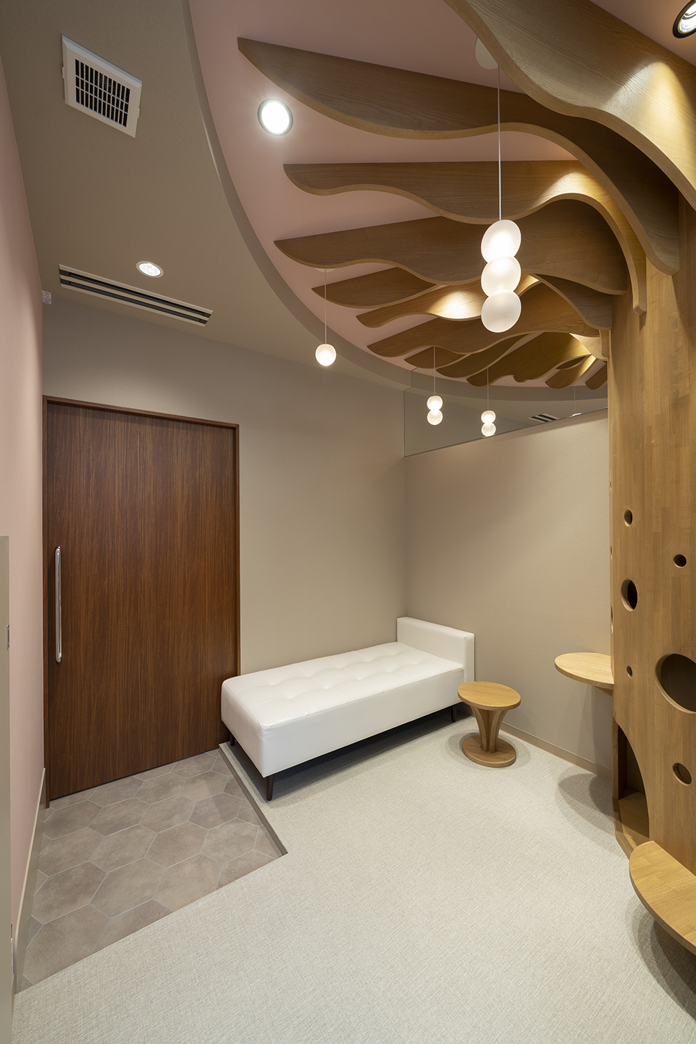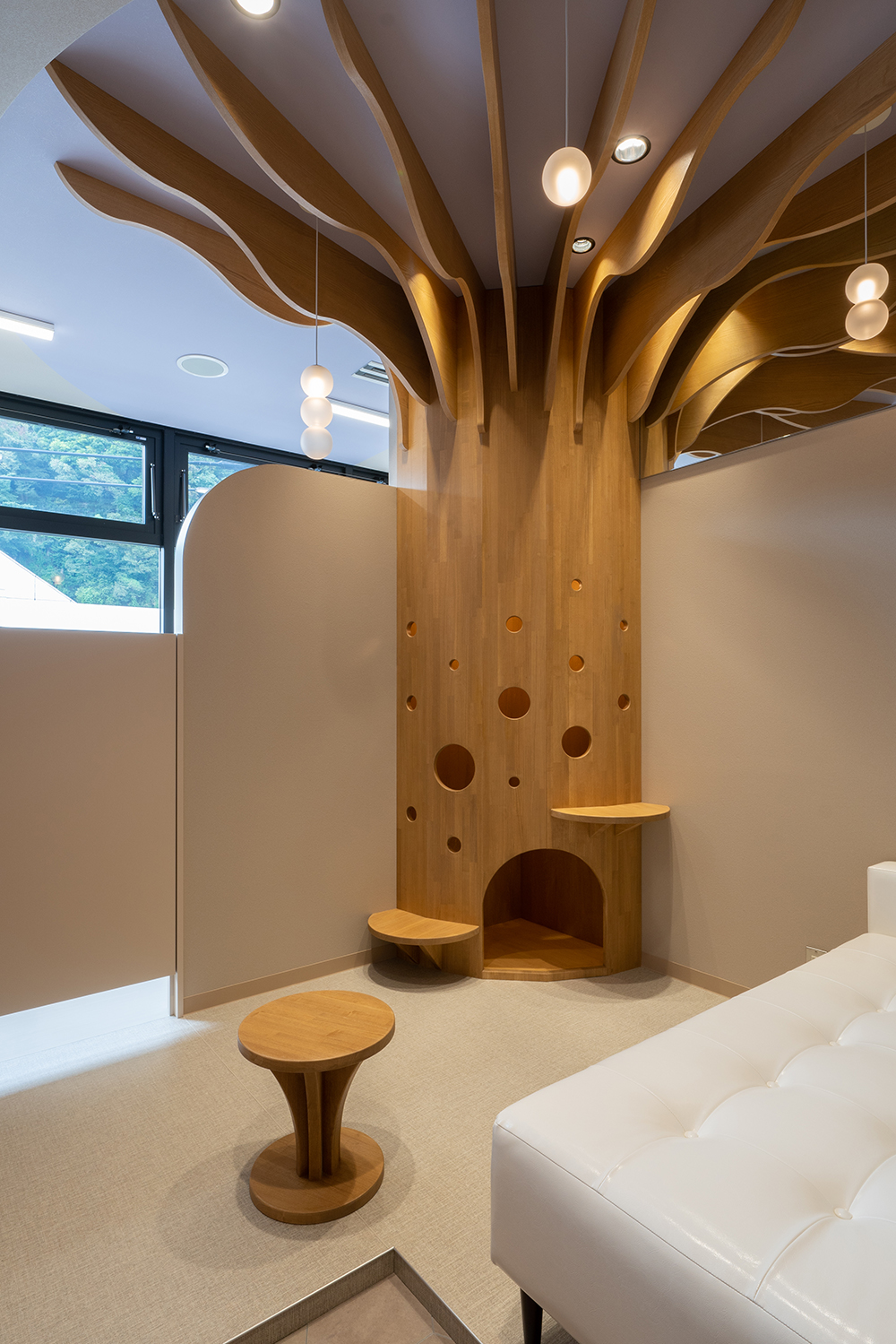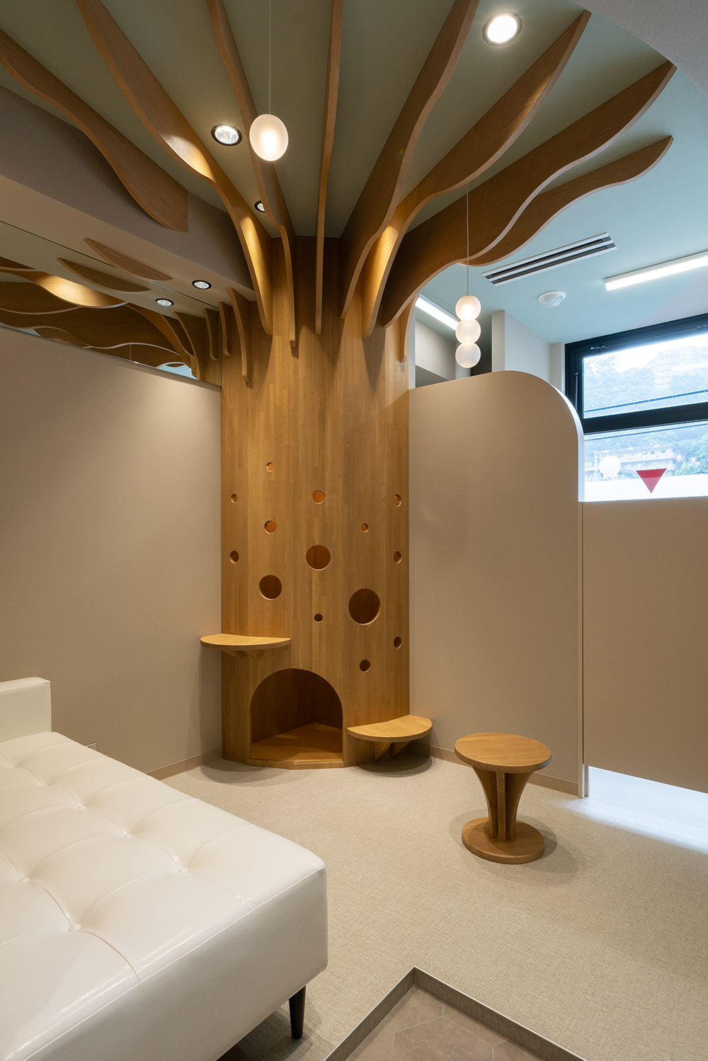 待合、診察、会計と多くの機能を併せもつこの「診察室」は、オペレーションが可能な室数として5室計画している。また診察室内には、通常当たり前にある医師のデスク、椅子、パソコン、患者の椅子、診察用ベッドが無く、代わりに患者が腰掛けるベンチソファとスツール(みたいなテーブル)、そして大きな「樹」があるだけである。この大きな「樹」には子供だけが入れる穴があいており、診察を待つあいだの遊具であったり、少しでも子供たちがリラックスして診察受けれるようにという思いが込められた仕掛けである。