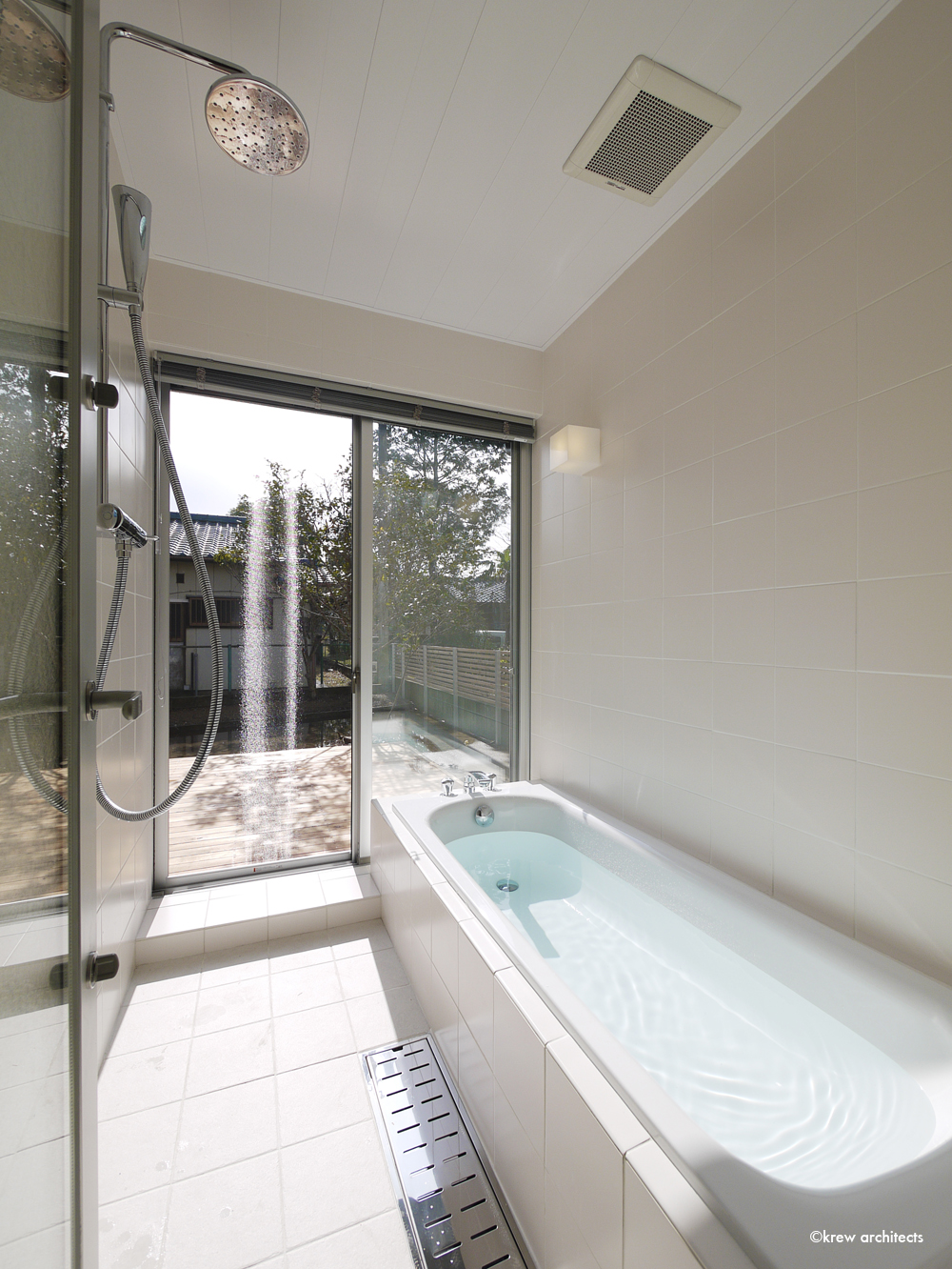 真っ白なバスルームは、海から戻った際にテラスから直接アプローチできる動線を確保。