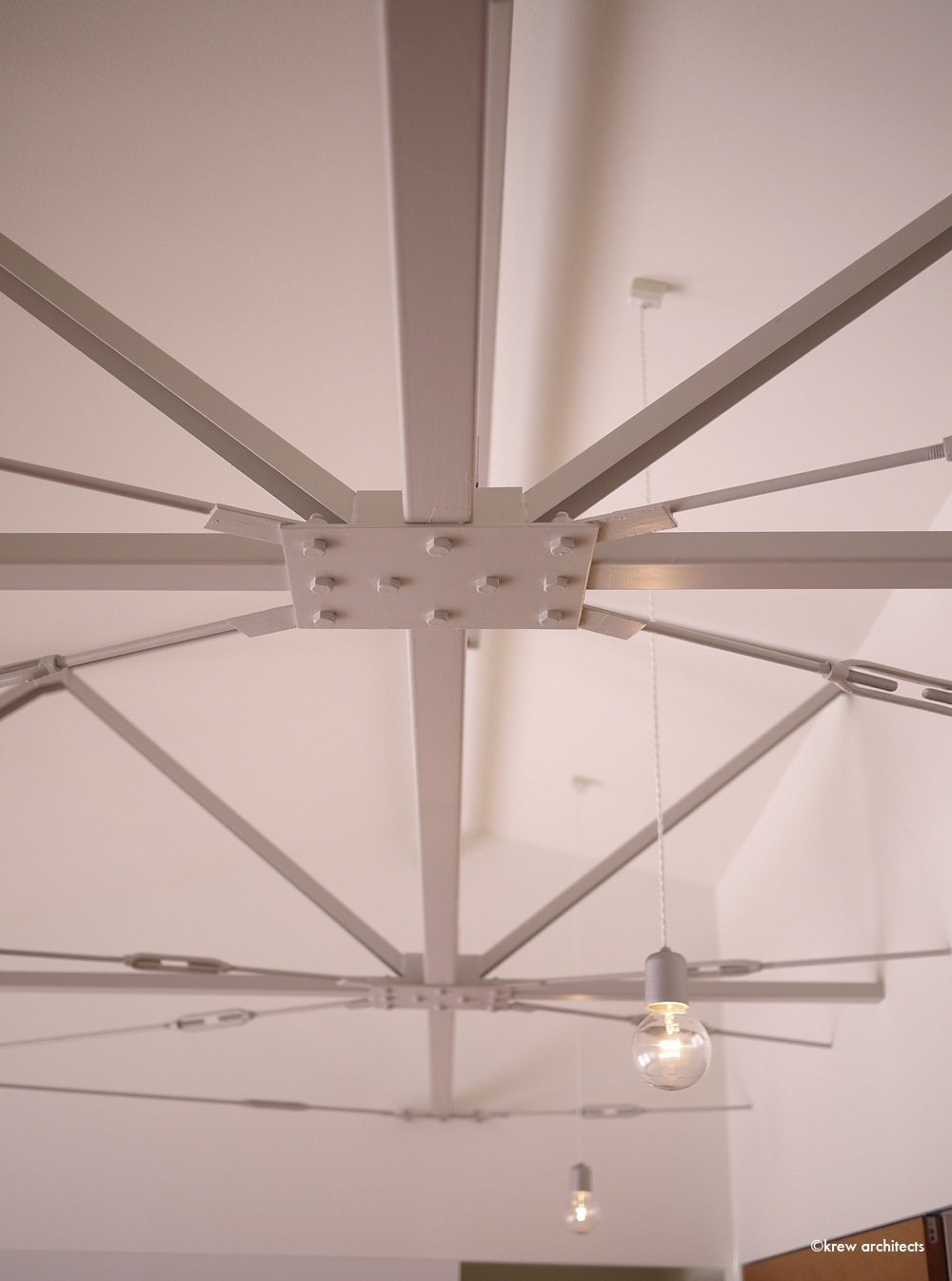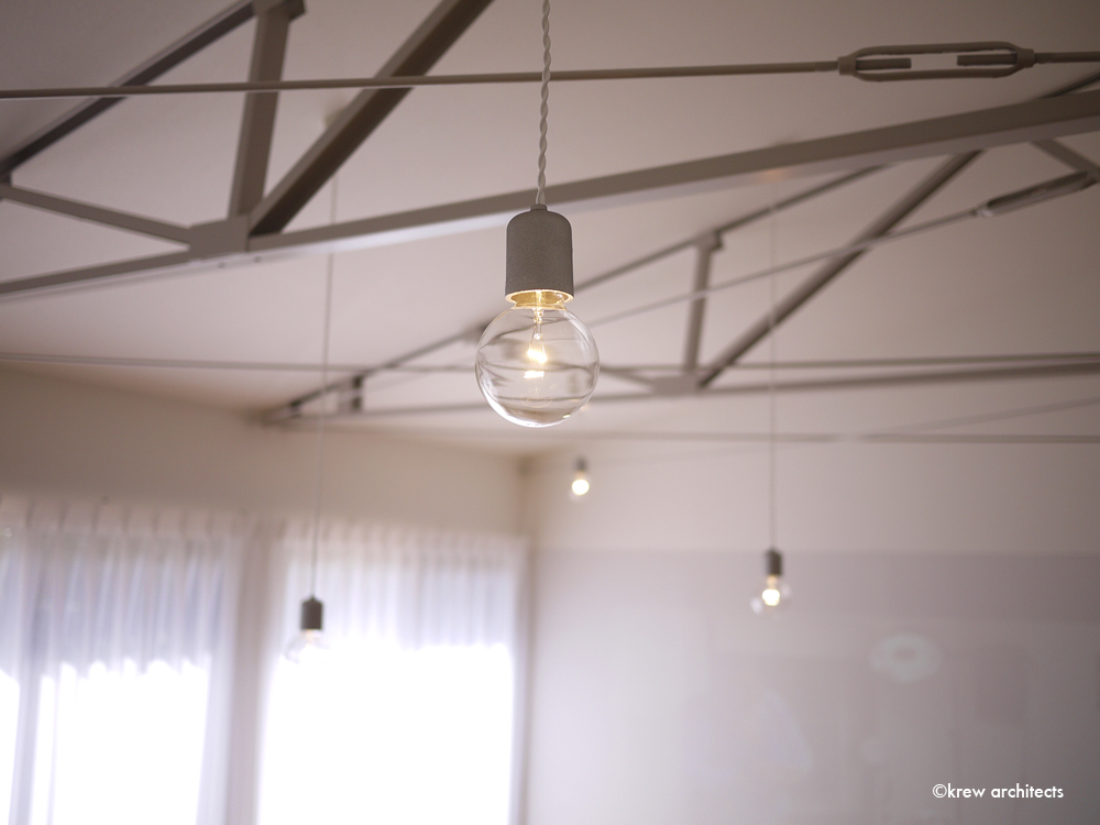 既存鉄骨フレームはライトグレーに塗装し、勾配天井に沿ってランダムに配置したプリミティブなペンダントライトの高さは、その傾斜によって自然に決定されている。