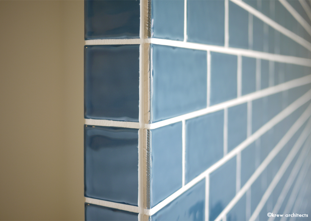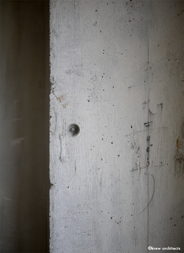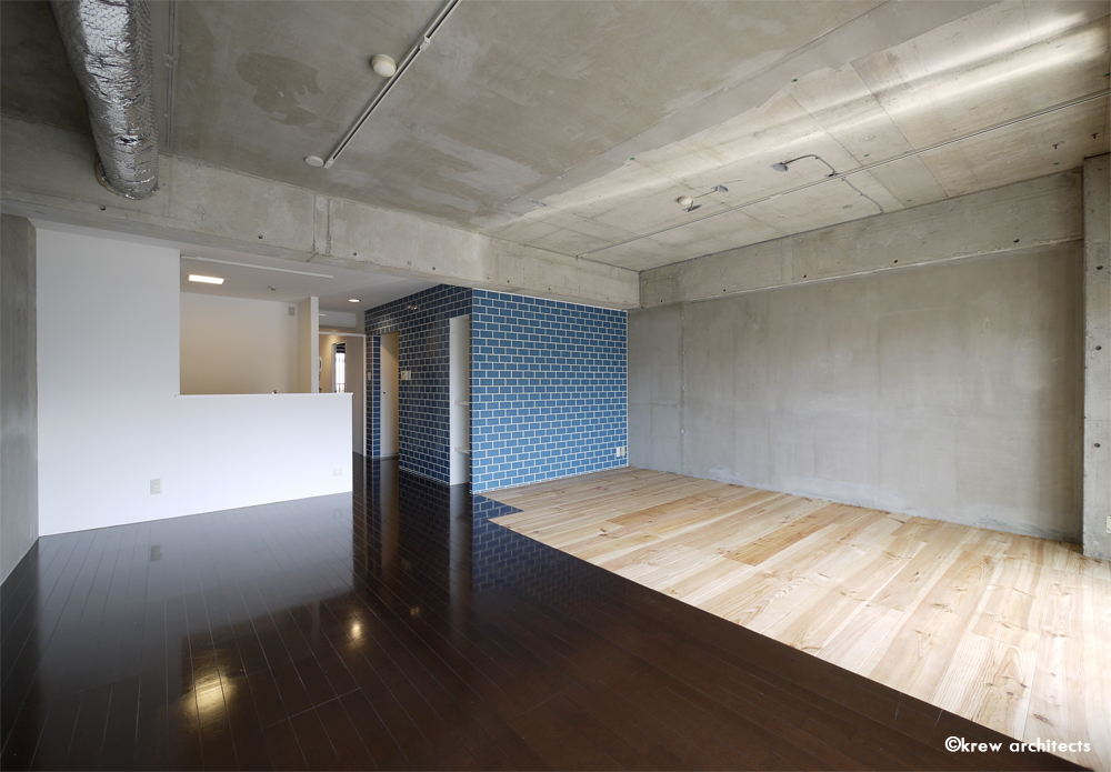 いずれ貼替えることになる壁紙の面をできるだけ減らし、コンクリートむき出しとタイル貼りというタフな素材とした。