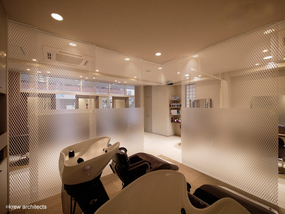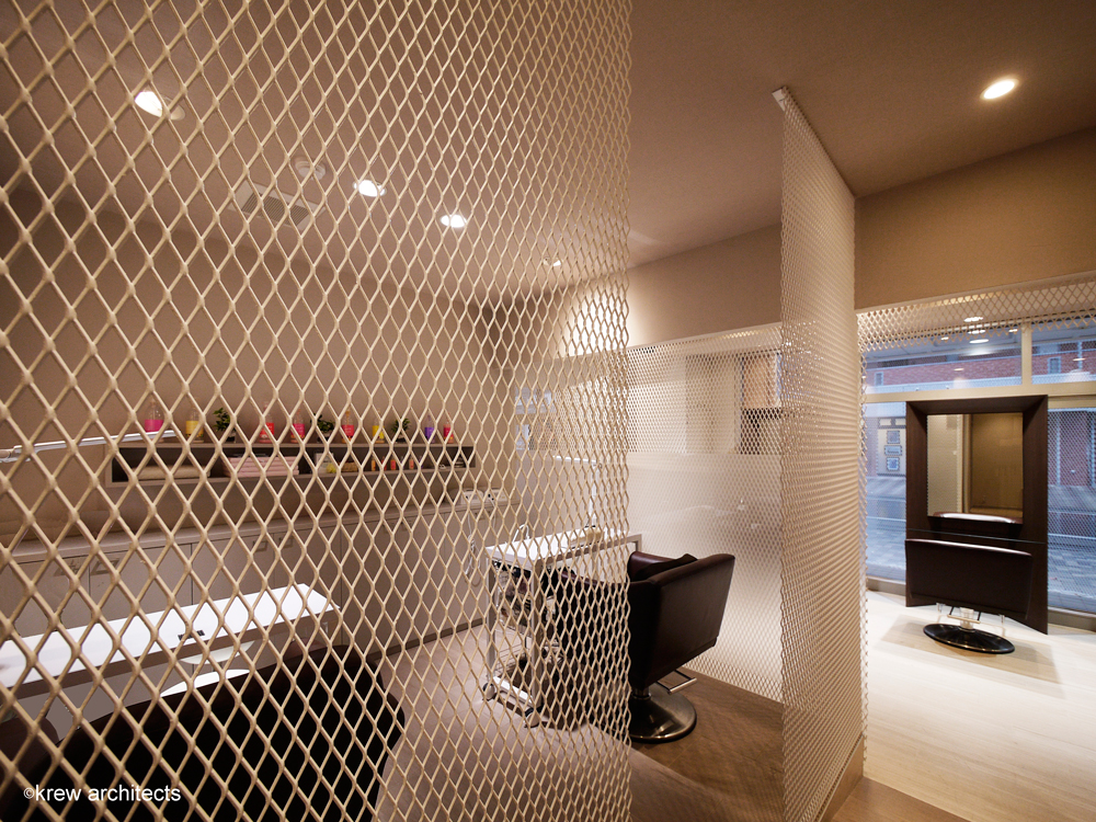 「点と点をつなぐ」というお店のコンセプトを 「大きなお店を一つにつなぐ」「外と中を同素材によりつなぐ」事をエキスパンドメタルの二重の膜により