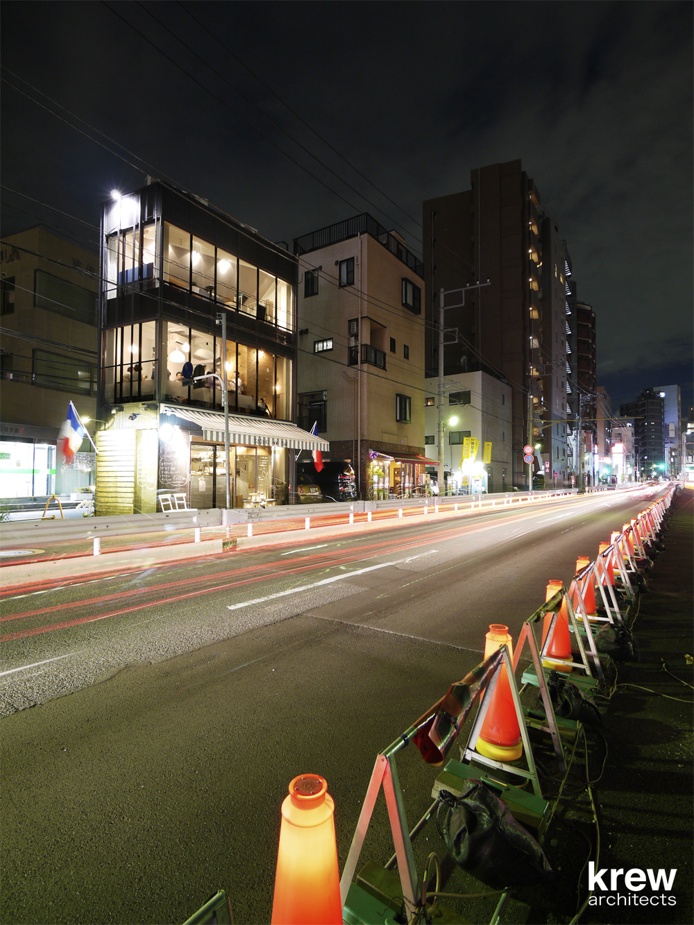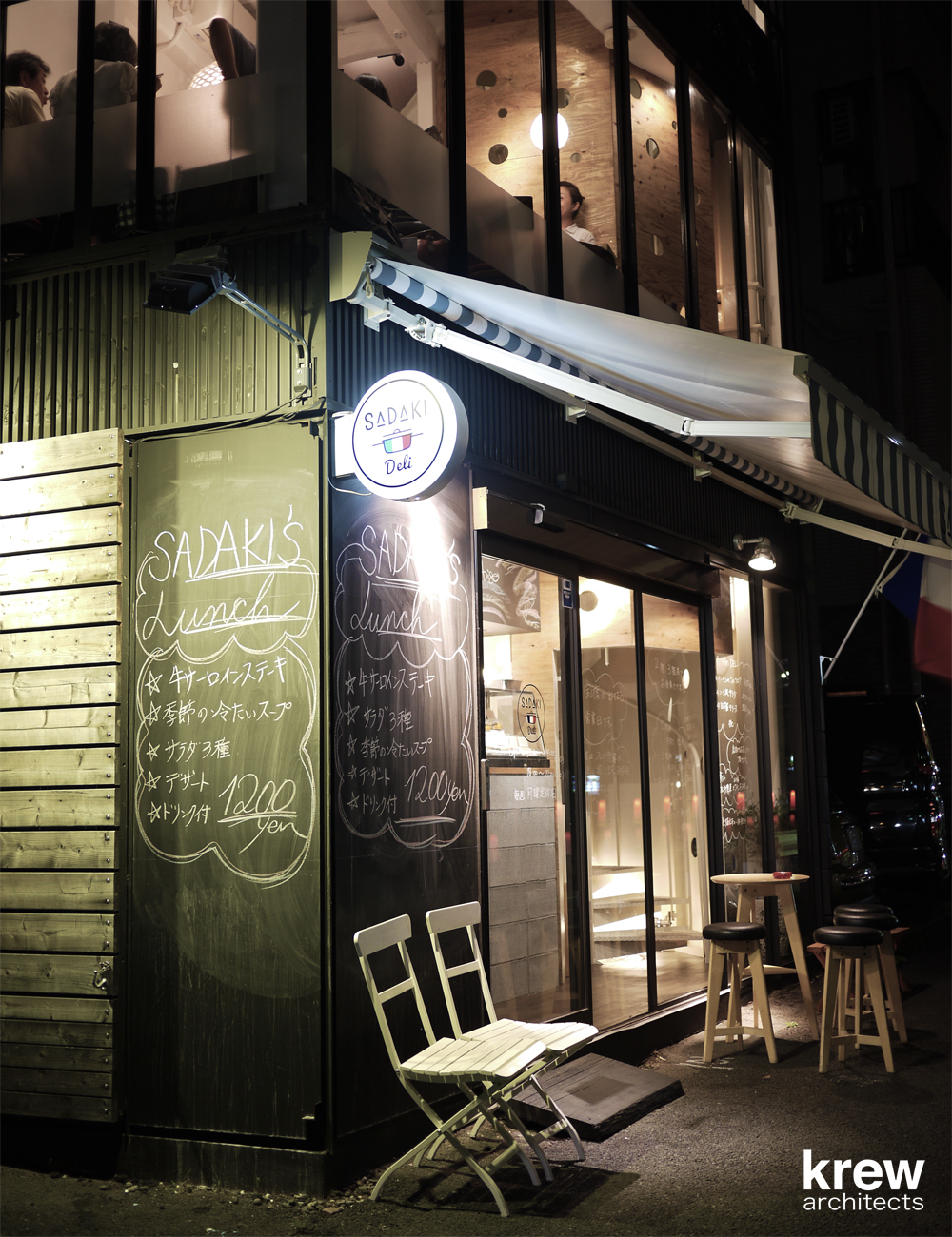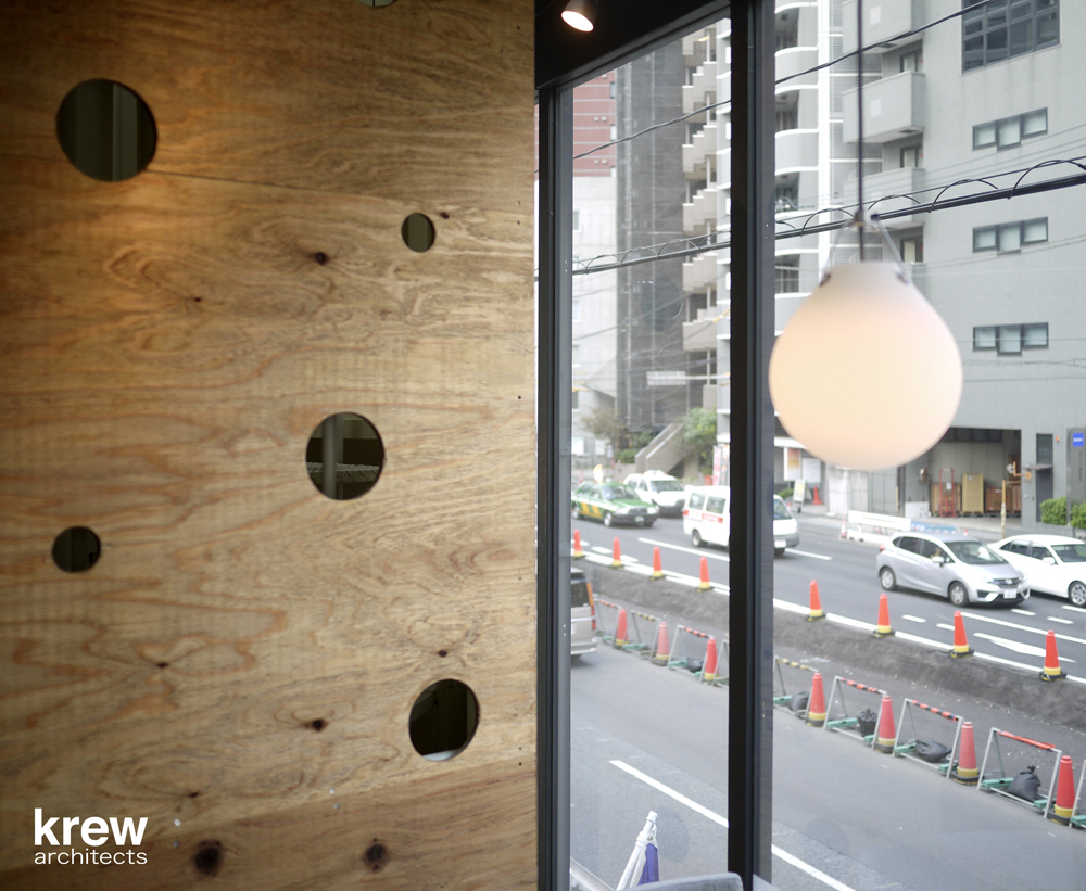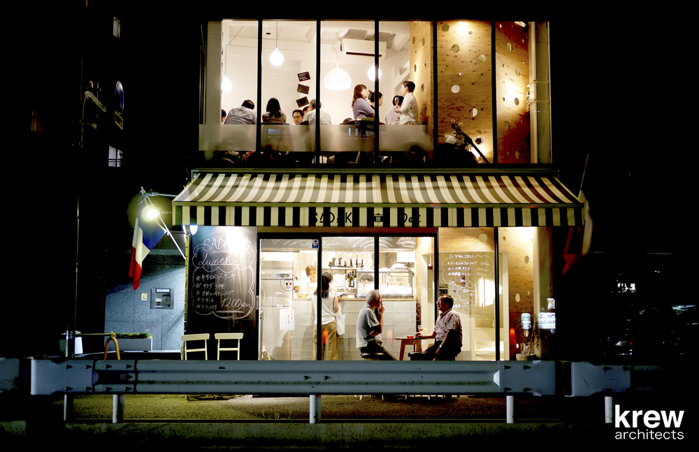 3階建て黒い外観、ガラスファサードの開放的な建物の3フロアを螺旋階段が貫いている。飲食店のサービスを考えると決して良いとは言いがたいこの階段を逆手に取り、『店の顔』として利用する事ができないかと考えた。店の中に立ち上がる『1本の樹』をイメージし、螺旋階段の周囲をラーチ合板で囲っている。階段の格子手摺、客席との関係性、光の入り方、外部からの見え方を考えながら、図面に表せない大小様々な穴を現場で即興的に開けている。内部に不思議な空間を創ると共に、外部に表出するユーモラスな見た目は店のインテリアとして、また前の山手通りへのサインとして機能することを意図した。コンクリートブロックやラーチ合板のラフな仕上げはオーナー梶原節紀氏が求める『堅苦しいフレンチレストランではない、誰でも気軽に立ち寄れる店』を意識して選定している。2015年6月に植えたサダキデリという『1本の樹』は、すでに不動前のこの地にしっかりと根を張り始めている。