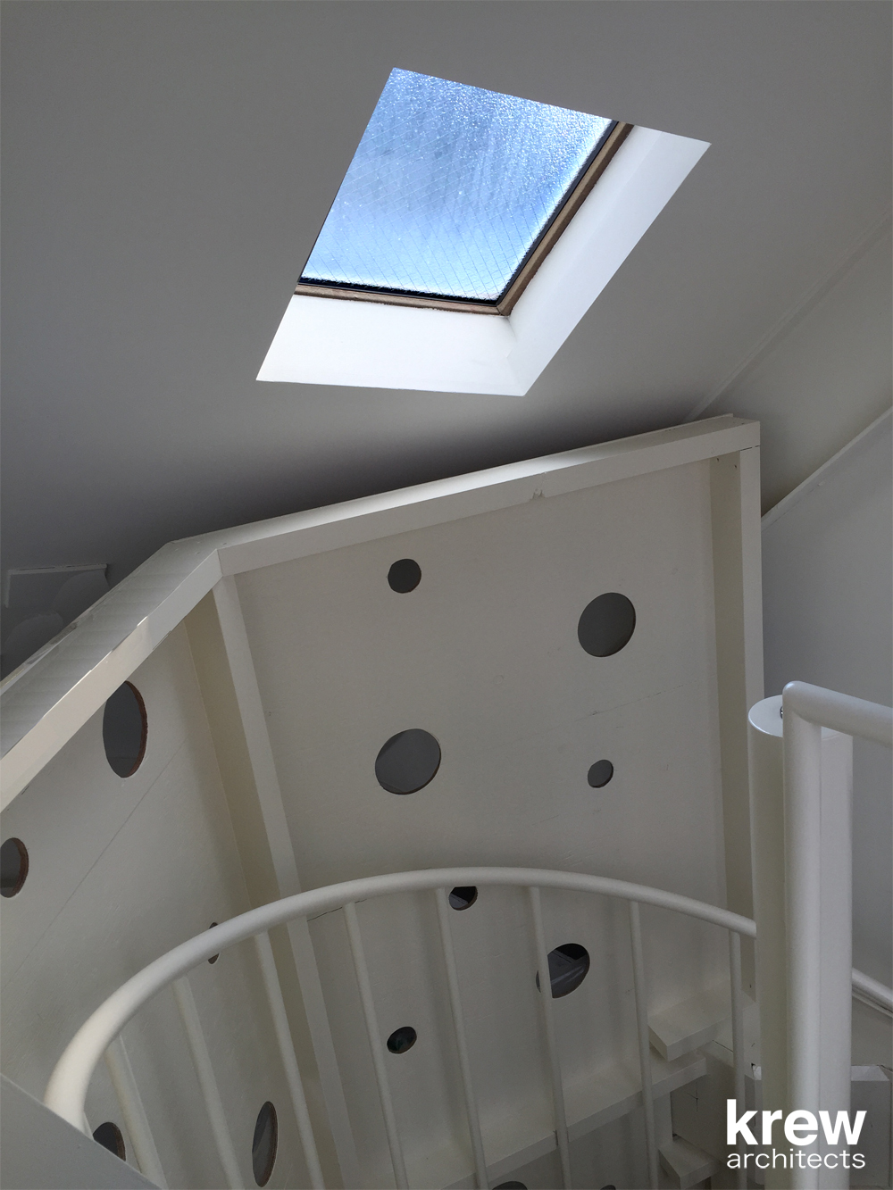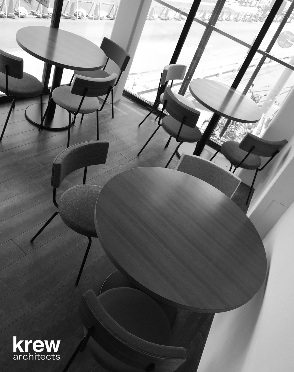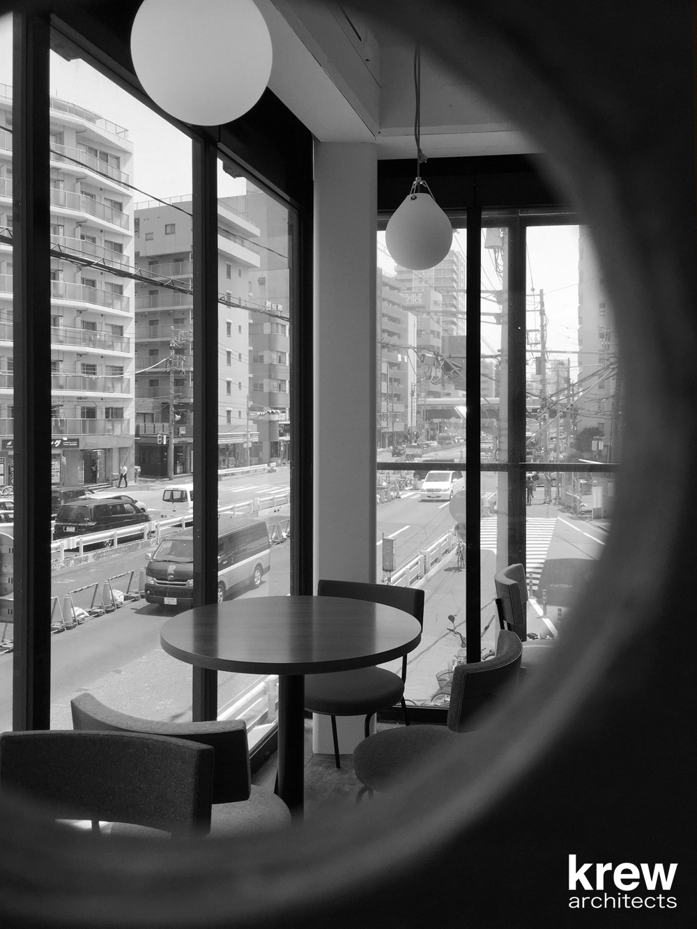 3階建て黒い外観、ガラスファサードの開放的な建物の3フロアを螺旋階段が貫いている。飲食店のサービスを考えると決して良いとは言いがたいこの階段を逆手に取り、『店の顔』として利用する事ができないかと考えた。店の中に立ち上がる『1本の樹』をイメージし、螺旋階段の周囲をラーチ合板で囲っている。階段の格子手摺、客席との関係性、光の入り方、外部からの見え方を考えながら、図面に表せない大小様々な穴を現場で即興的に開けている。内部に不思議な空間を創ると共に、外部に表出するユーモラスな見た目は店のインテリアとして、また前の山手通りへのサインとして機能することを意図した。コンクリートブロックやラーチ合板のラフな仕上げはオーナー梶原節紀氏が求める『堅苦しいフレンチレストランではない、誰でも気軽に立ち寄れる店』を意識して選定している。2015年6月に植えたサダキデリという『1本の樹』は、すでに不動前のこの地にしっかりと根を張り始めている。
