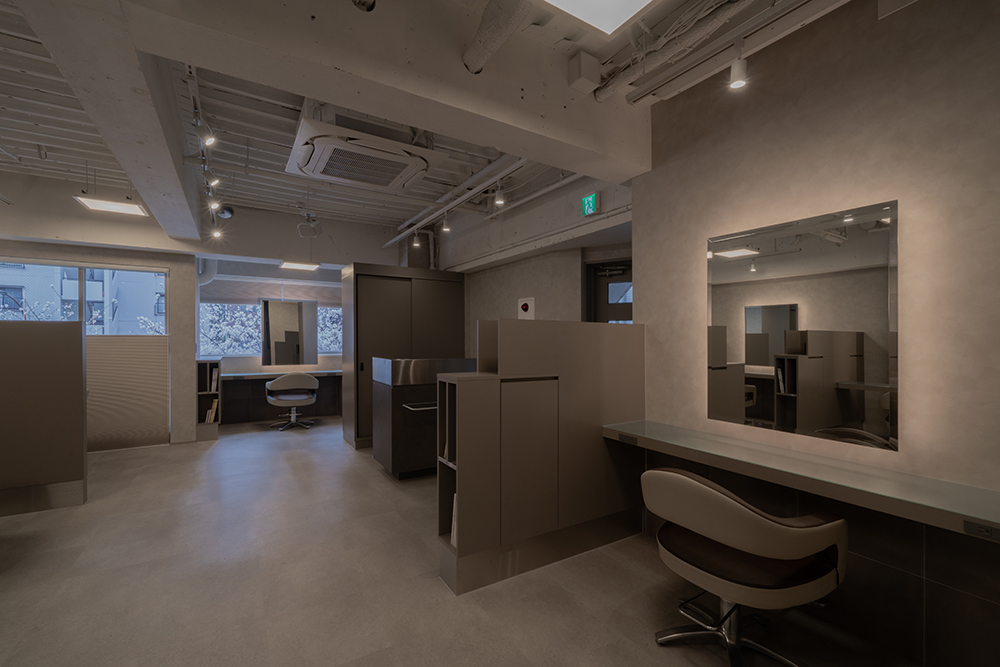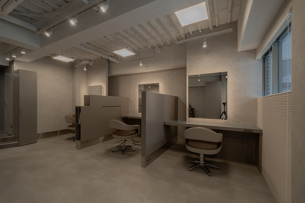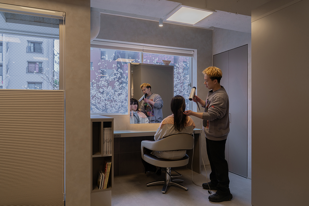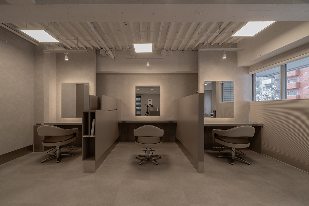 ご来店されたお客様への配慮を一番に考慮し、カットスペースを家具で区画するデザインにいたしました。 カット席へ座ると半個室のような空間でヘアーブローをお楽しみいただけます。